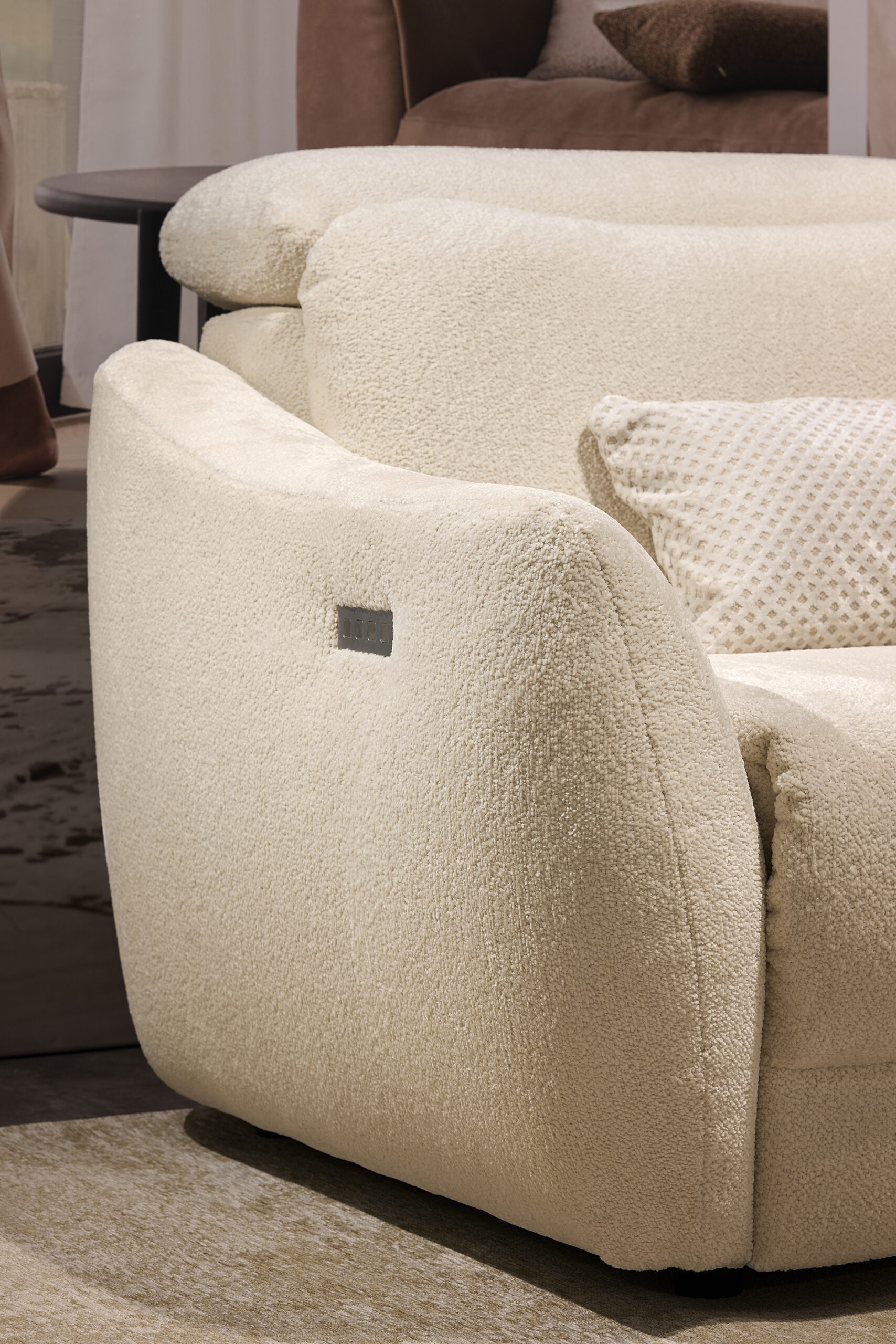 Les têtières ou appuis-tête se relèvent ou se baissent à la main à l’aide d’une crémaillère. Pour élever les jambes, 2 flap électriques s’actionnent par d’élégants boutons latéraux ou une télécommande.