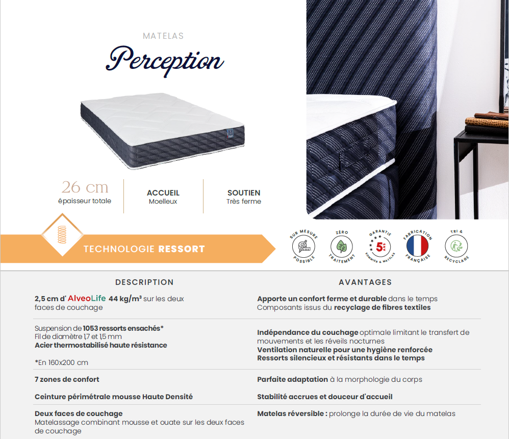 - Suspension de 1053* ressorts ensachés, 7 zones de confort, associée à une ceinture périmétrale haute densité pour plus de stabilité.